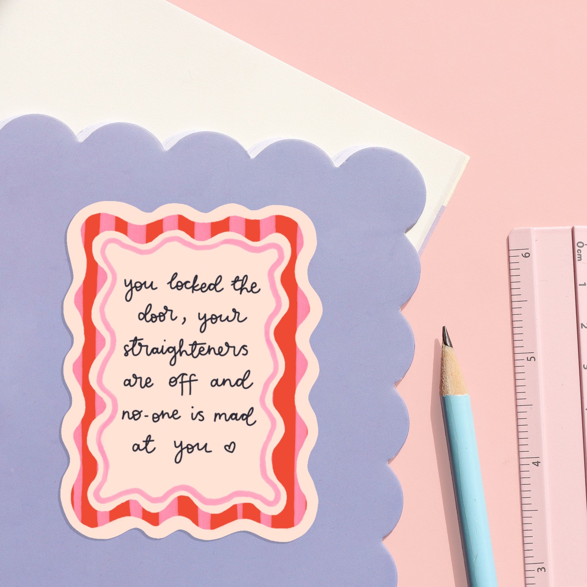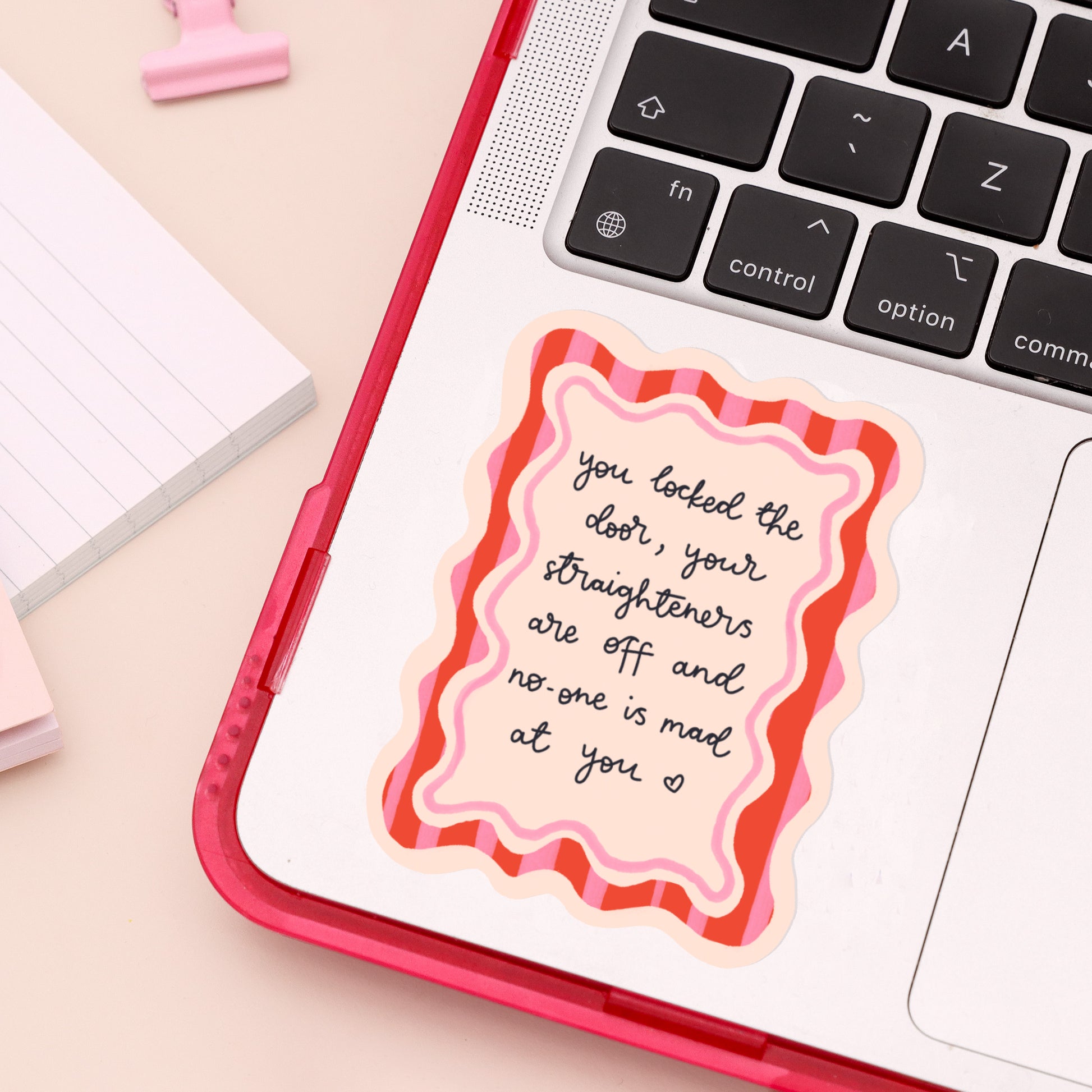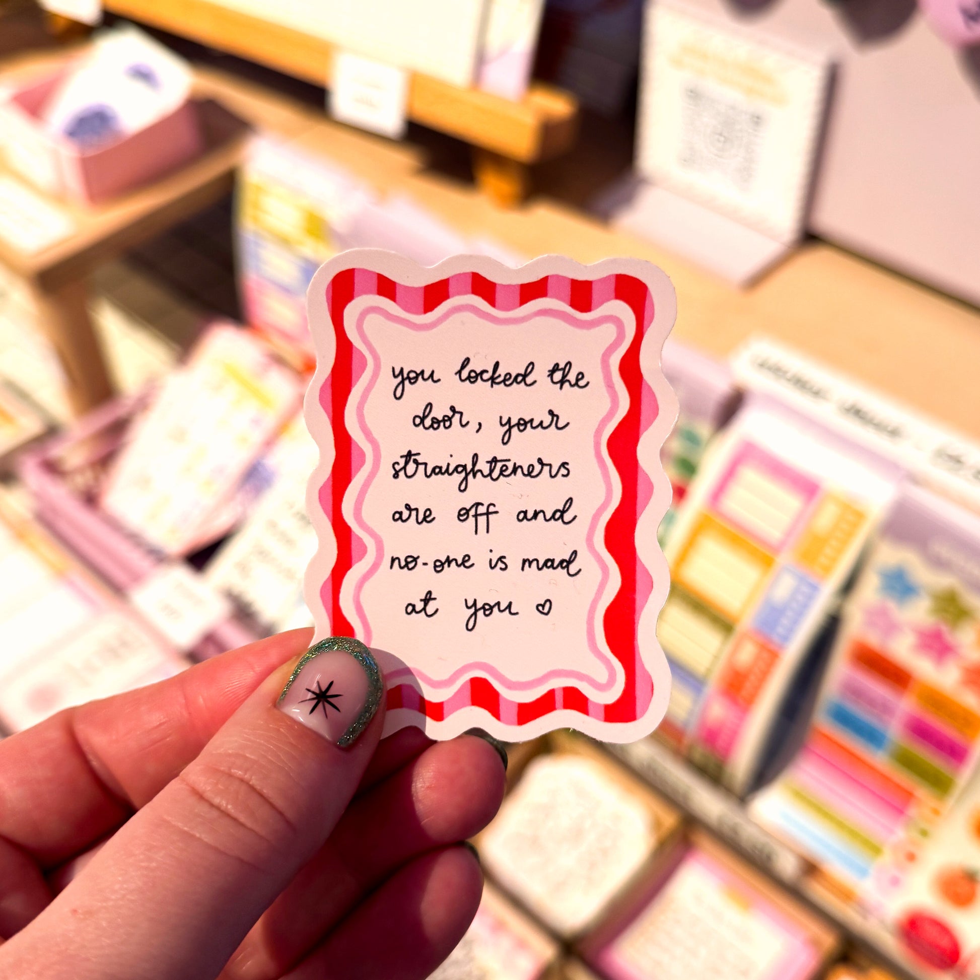 This vinyl sticker features the ultimate anxiety-busting mantra: "You locked the door, your straighteners are off and no-one is mad at you."